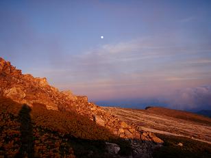 ↓その反対側ではお月さま。山が夕日に照らされてオレンジ色。