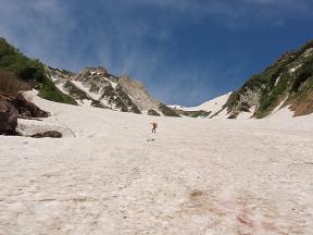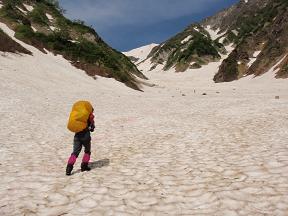 ↓登りはじめて1時間ほどで大雪渓にさしかかる。