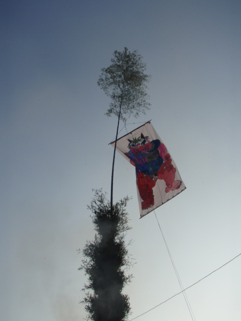 竹を重ねてたちあげ、てっぺんに鬼の絵を飾って
