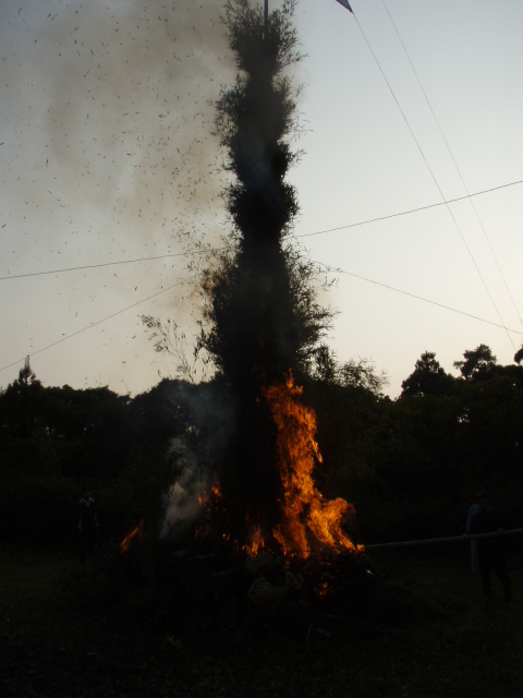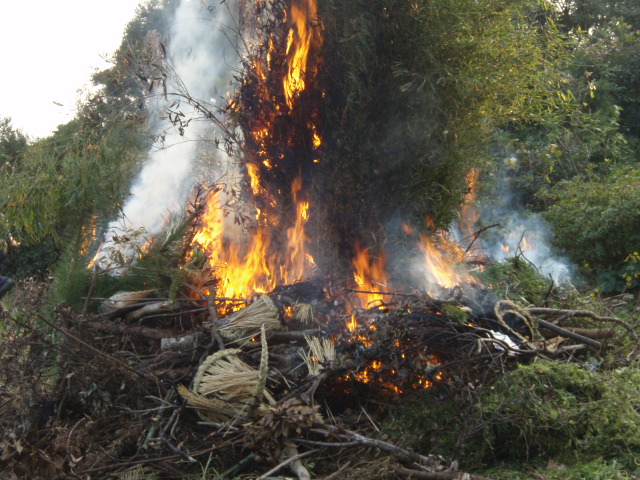 燃やす一番したの部分にはしめ縄などの正月の飾りがほおりこまれ、一緒に燃やす。